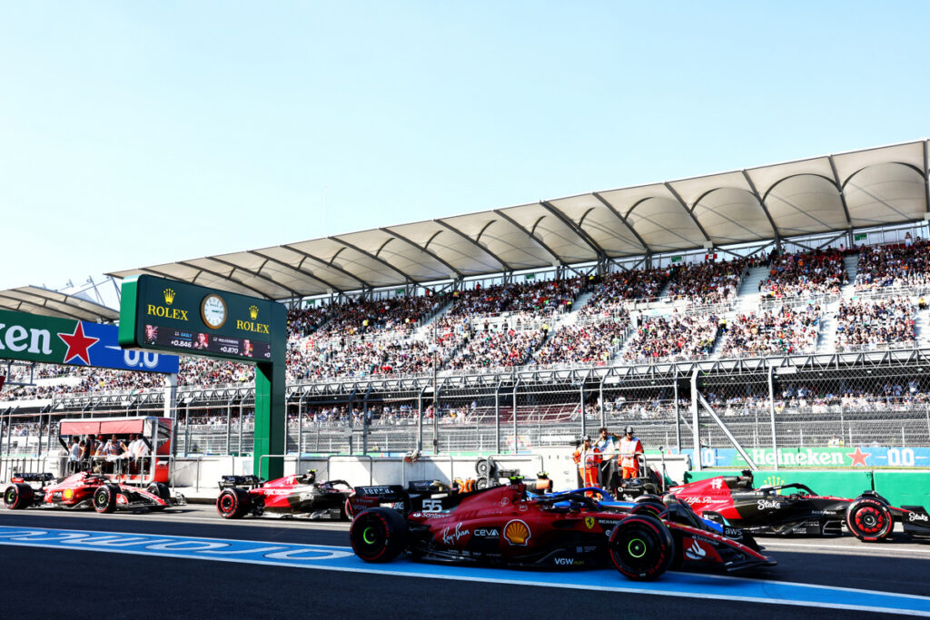 Carlos Sainz Jr (ESP) Ferrari SF-23 passes the stationary Valtteri Bottas (FIN) Alfa Romeo F1 Team C43; Logan Sargeant (USA) Williams Racing FW45; Zhou Guanyu (CHN) Alfa Romeo F1 Team C43; and Charles Leclerc (MON) Ferrari SF-23 at the end of the pit lane. 28.10.2023. Formula 1 World Championship, Rd 20, Mexican Grand Prix, Mexico City, Mexico, Qualifying Day. – www.xpbimages.com, EMail: [email protected] © Copyright: Bearne / XPB Images