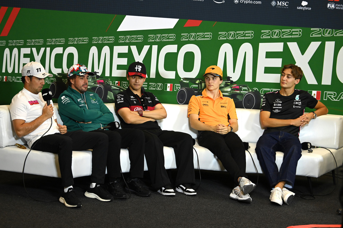 (L to R): Sergio Perez (MEX) Red Bull Racing; Fernando Alonso (ESP) Aston Martin F1 Team; Zhou Guanyu (CHN) Alfa Romeo F1 Team; Oscar Piastri (AUS) McLaren; and George Russell (GBR) Mercedes AMG F1, in the FIA Press Conference. 26.10.2023. Formula 1 World Championship, Rd 20, Mexican Grand Prix, Mexico City, Mexico, Preparation Day. - www.xpbimages.com, EMail: [email protected] © Copyright: XPB Images