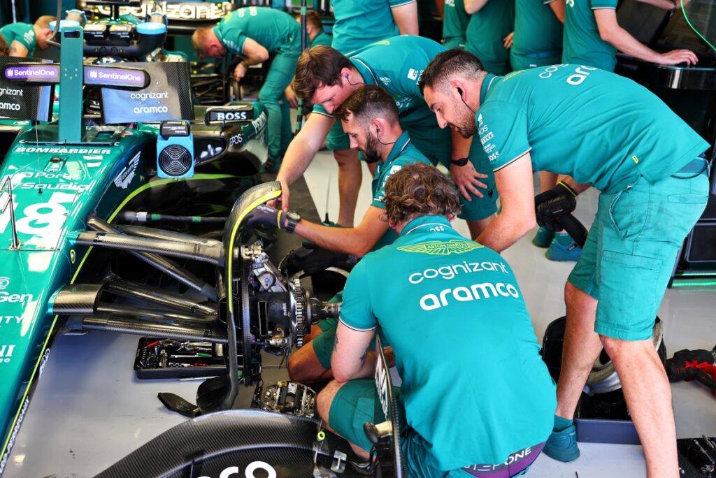 Aston Martin elected to withdraw its cars to the pitlane for Sunday’s race, reverting Fernando Alonso to the pre-Austin AMR23 and leaving Lance Stroll with the upgrades.
